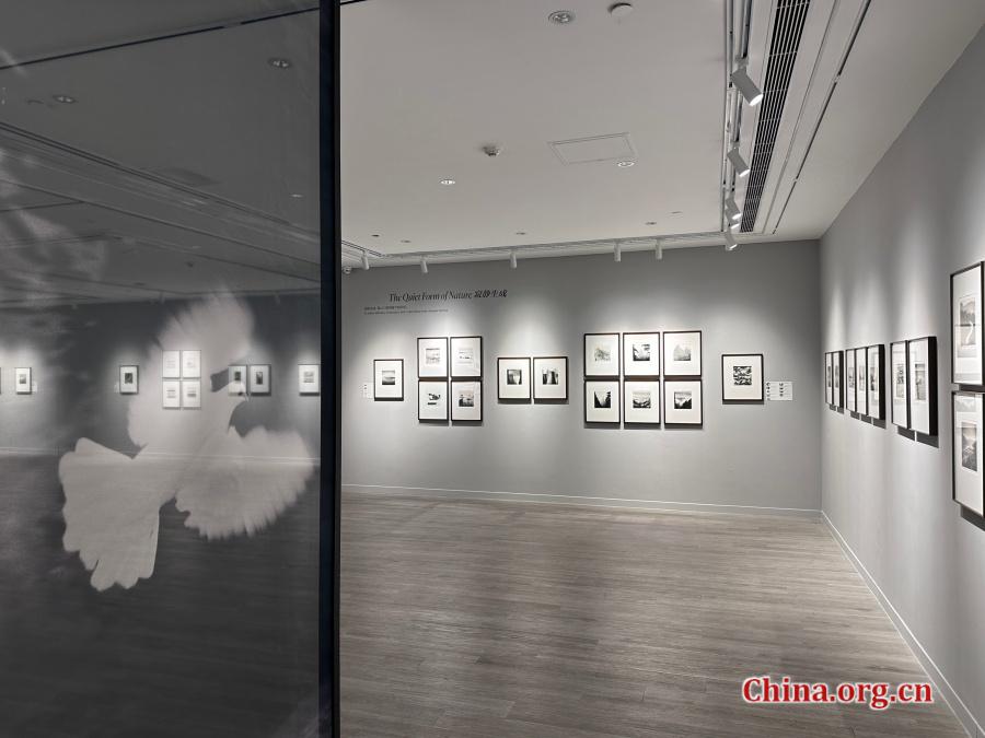 A large wall installation features Michael Kenna's image of a white bird at the "Light Etchings" exhibition at KWM Art Center in Beijing, July 30, 2025. The translucent presentation allows visitors to glimpse the rest of the gallery through the artwork, creating an interplay between subject and exhibition space. [Photo by Liu Ziying/China.org.cn]