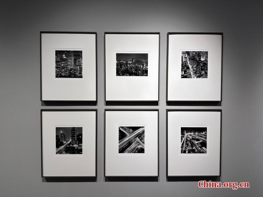 Michael Kenna's urban nightscapes from cities in China and the U.S. are displayed at the "Light Etchings" exhibition at KWM Art Center in Beijing, July 30, 2025. The photographs capture elusive light trails and silent architecture, revealing what Kenna describes as midnight's secrets made visible. [Photo by Liu Ziying/China.org.cn]