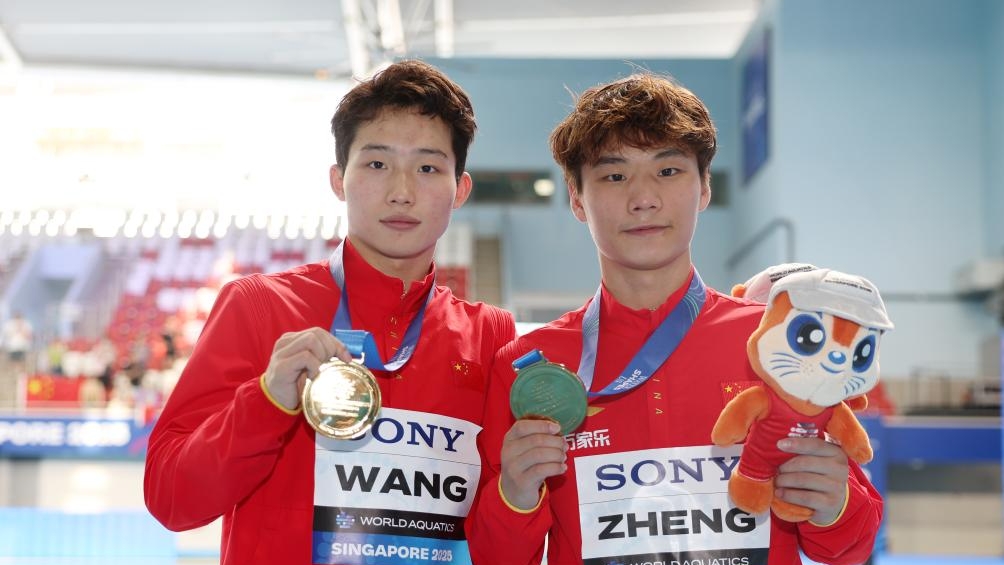 Qin Haiyang claimed the 2025 World Aquatics Championships men's 100-meter breaststroke title on Monday, securing China's first swimming gold medal at the tournament, while the country's diving team added two more golds in the men's three-meter synchronized springboard and the women's 10-meter synchronized platform events.